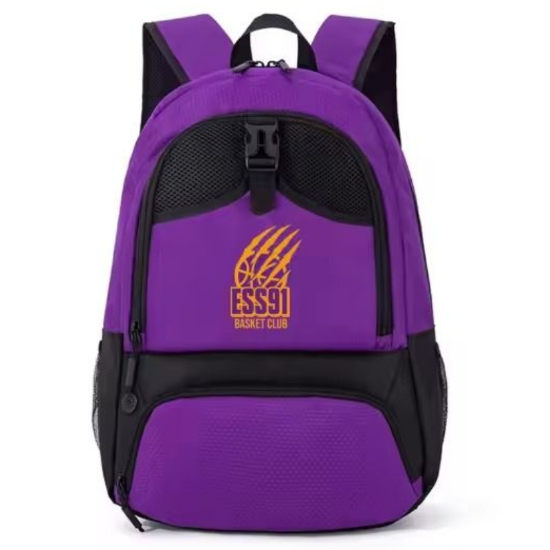 Sac a dos, ayant un contenant pour un ballon de basket, une paire de basket et une gourde.